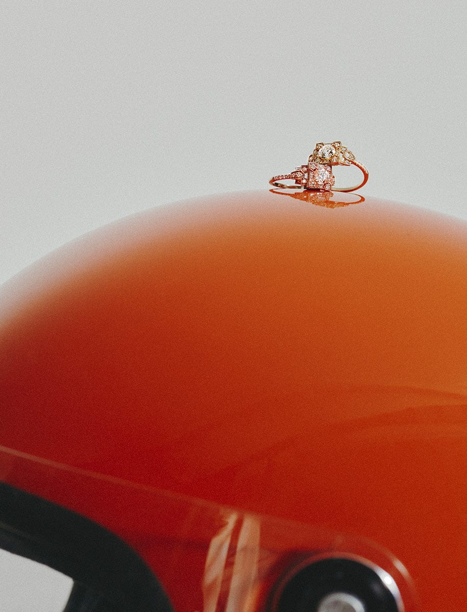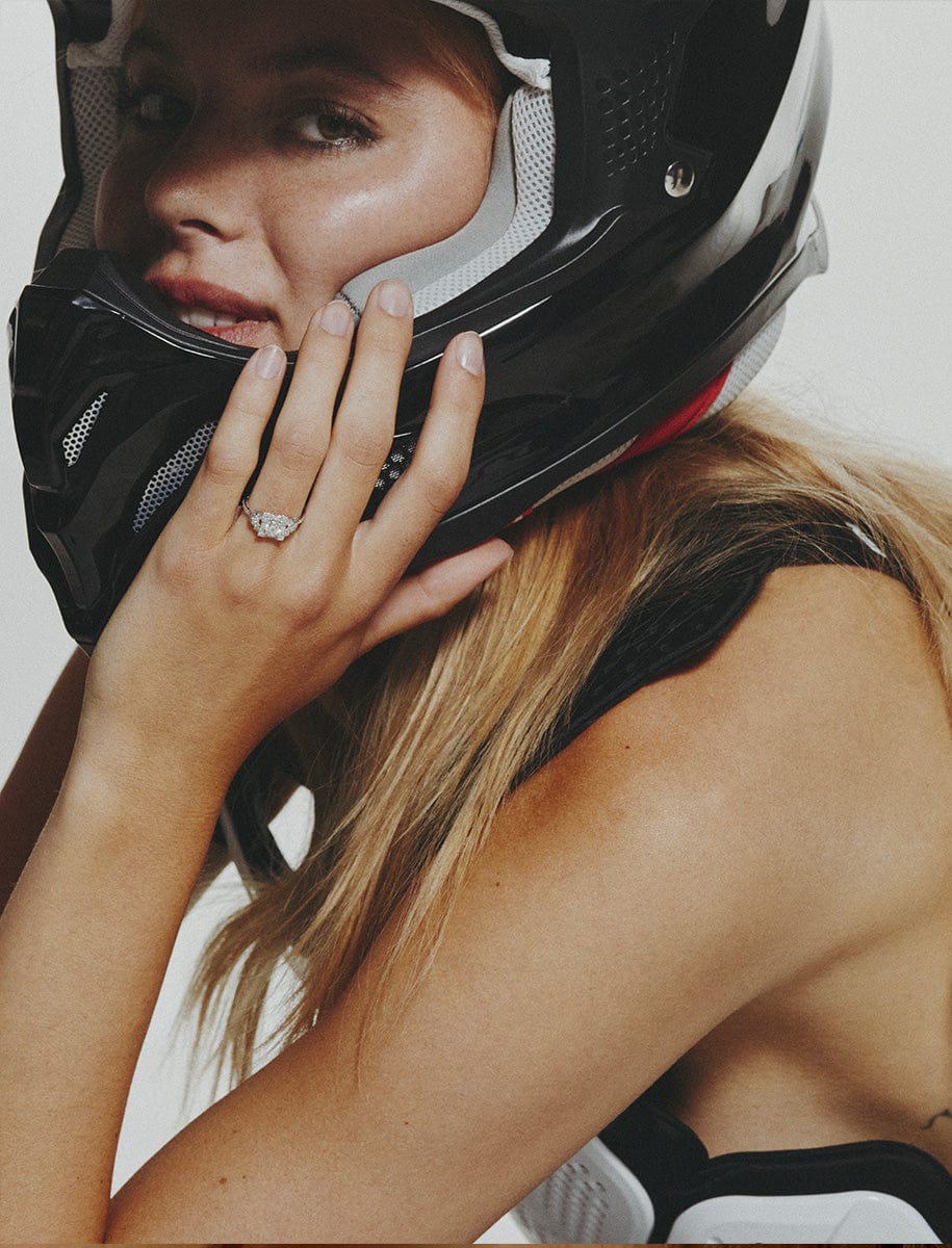 Inspirée de Susan Sarandon dans Thelma & Louise, cette bague évoque l’élan, la vitesse, et l’indépendance. Ses lignes sont franches et modernes, aux influences Art Déco.