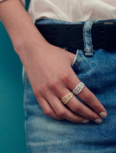 Emblème de la collection, cette bague se compose de dessins inspirés par le symbolisme floral de l’Angleterre Victorienne. Les diamants bordés d’or perlé sont la signature de la Maison.