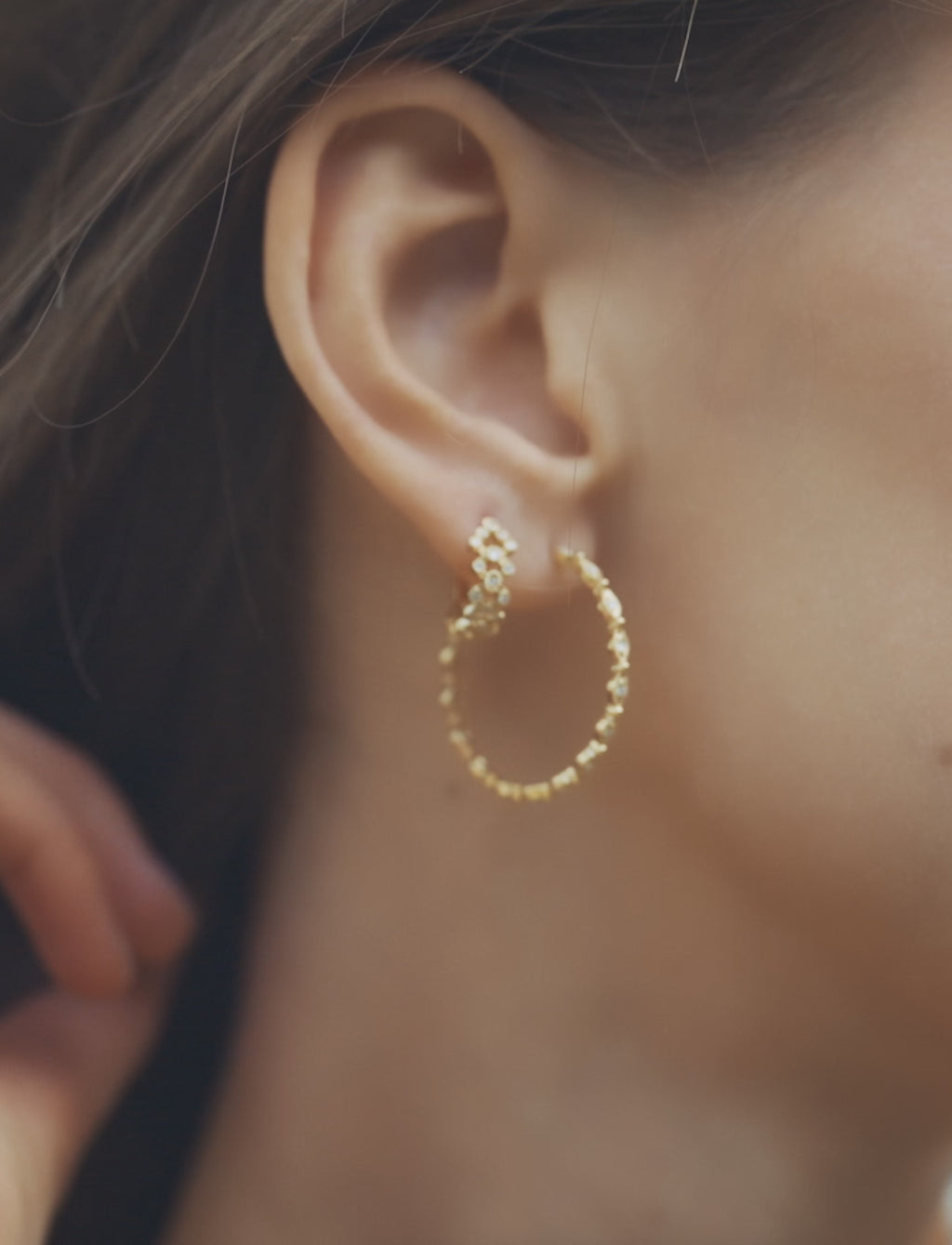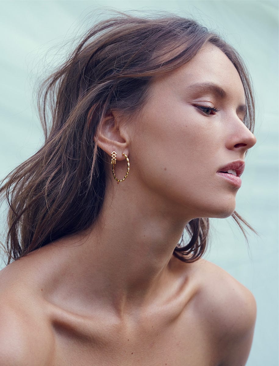 La créatrice revisite la mini créole, modèle signature de la Maison, dans l’esprit ensoleillé et aérien de la collection.