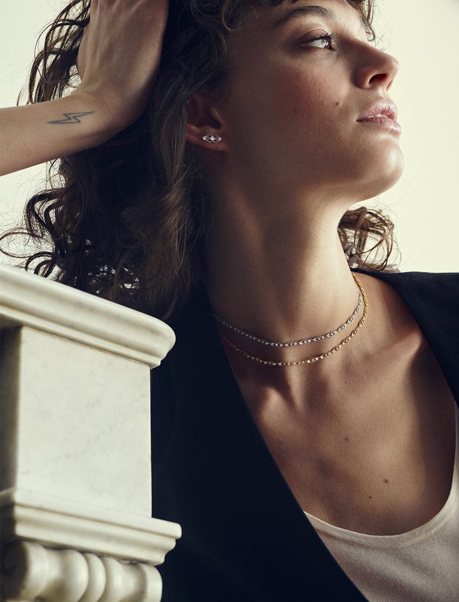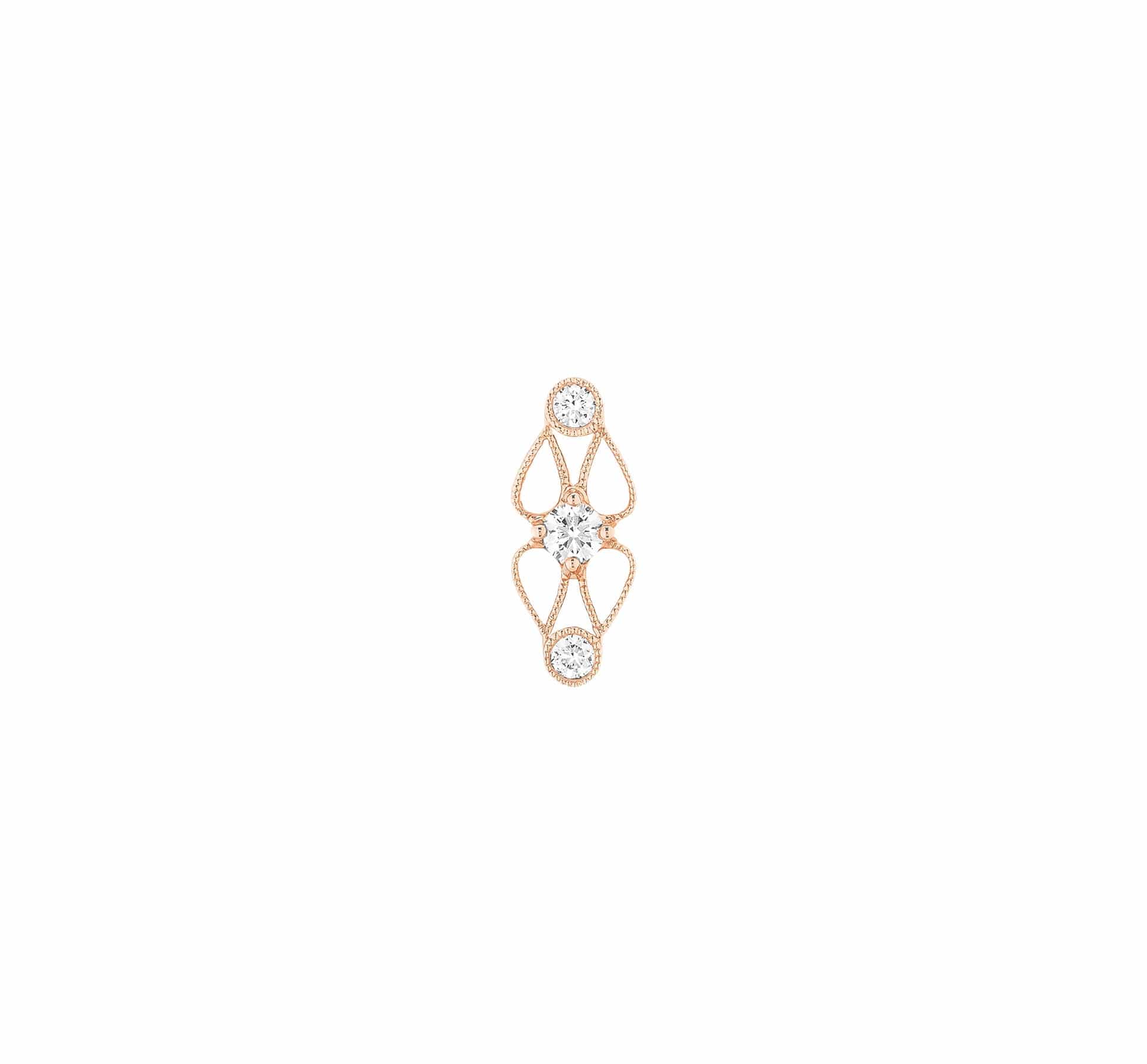 Cette boucle unique habille l’oreille d’un trio de diamants, tandis le motif emblématique de la collection, créé à partir de fils d'or, donne à ce bijou une allure intemporelle et élégante.