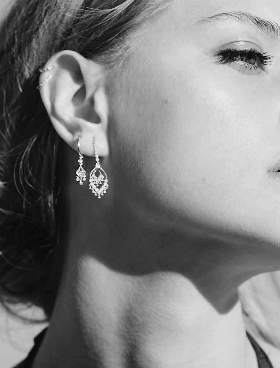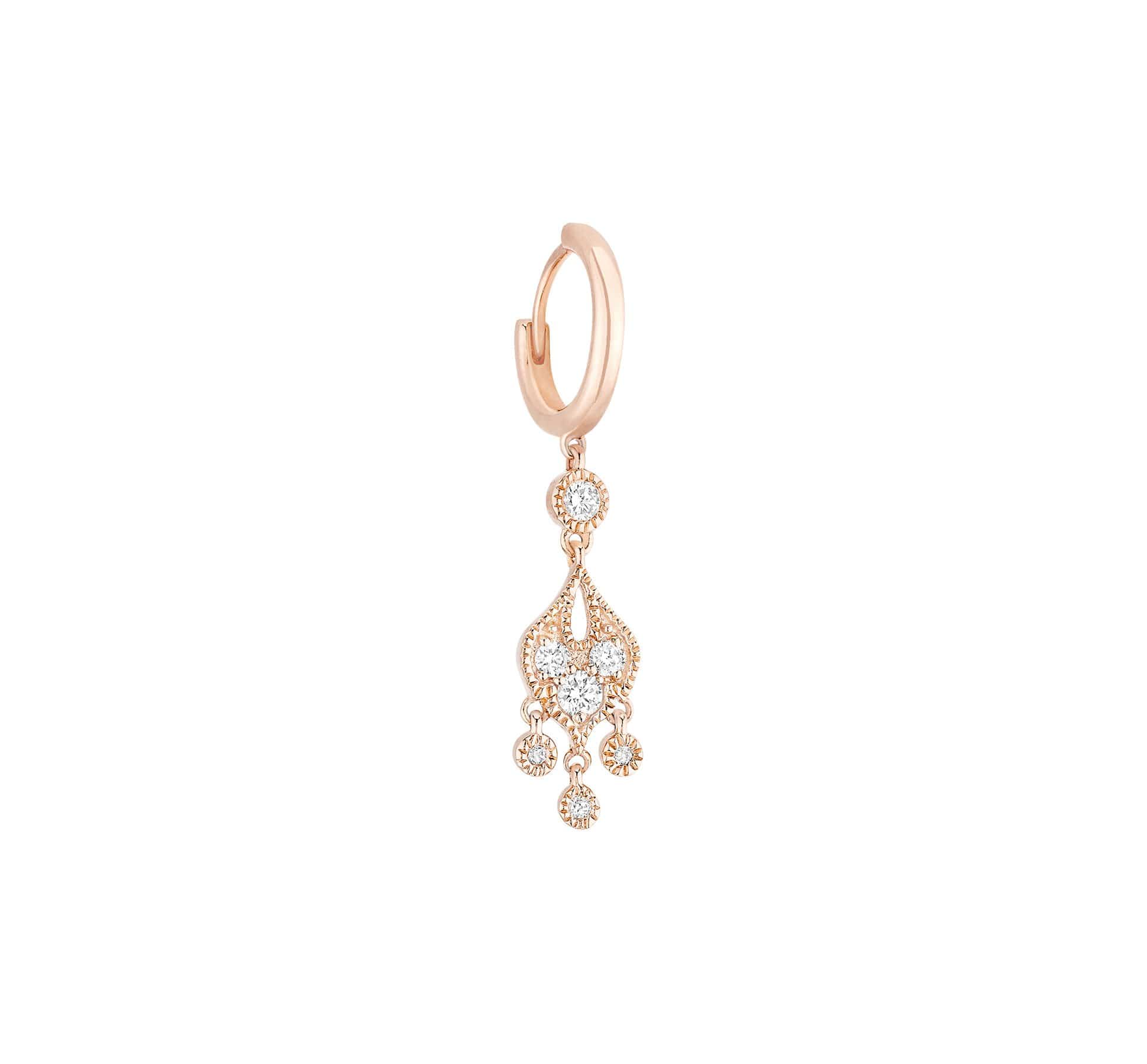 La mini créole Sultane nous plonge dans l'univers onirique du Moyen-Orient. Le motif, agrémenté de pampilles en diamants, bouge au rythme de vos mouvements et reflète la lumière. Associez-là à notre mini créole Talitha !