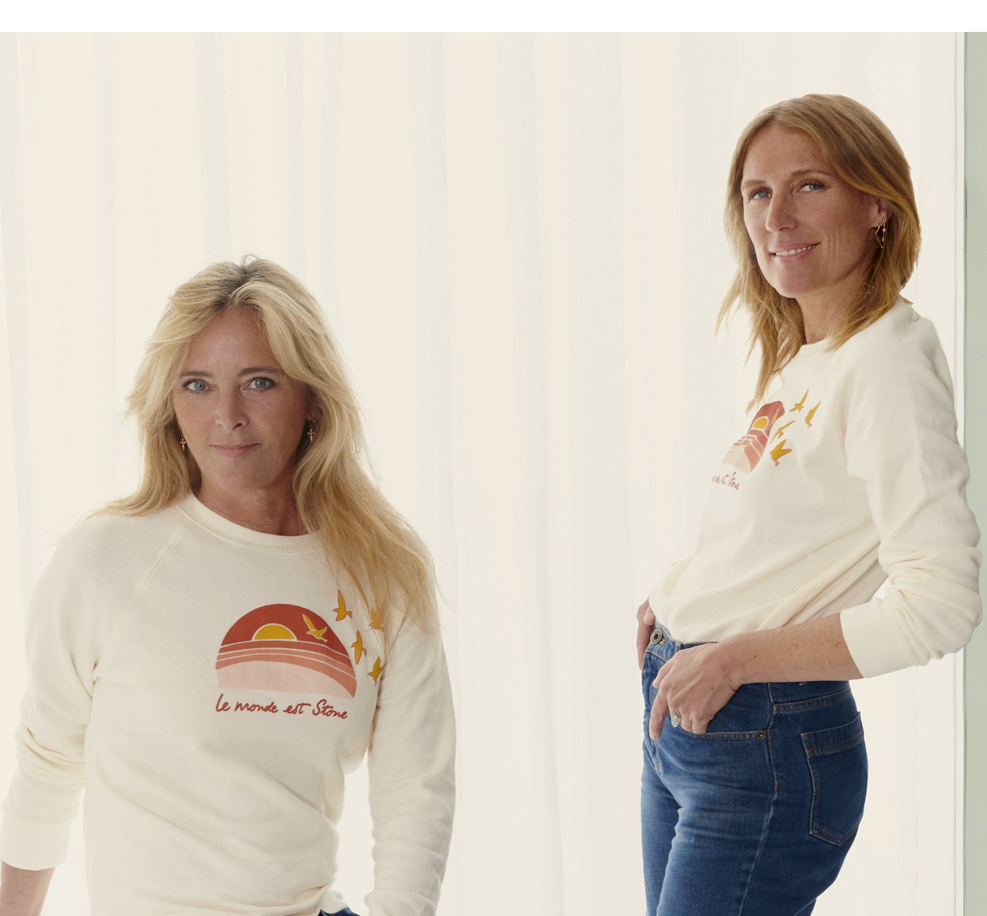 Marie s'associe à Agathe Lecaron, créatrice de la marque ron ron pour imaginer un sweat à leur image : joyeux et solaire ! Marqué du slogan "Le monde est Stone", il traduit la volonté des créatrices de s'adresser à toutes les générations.