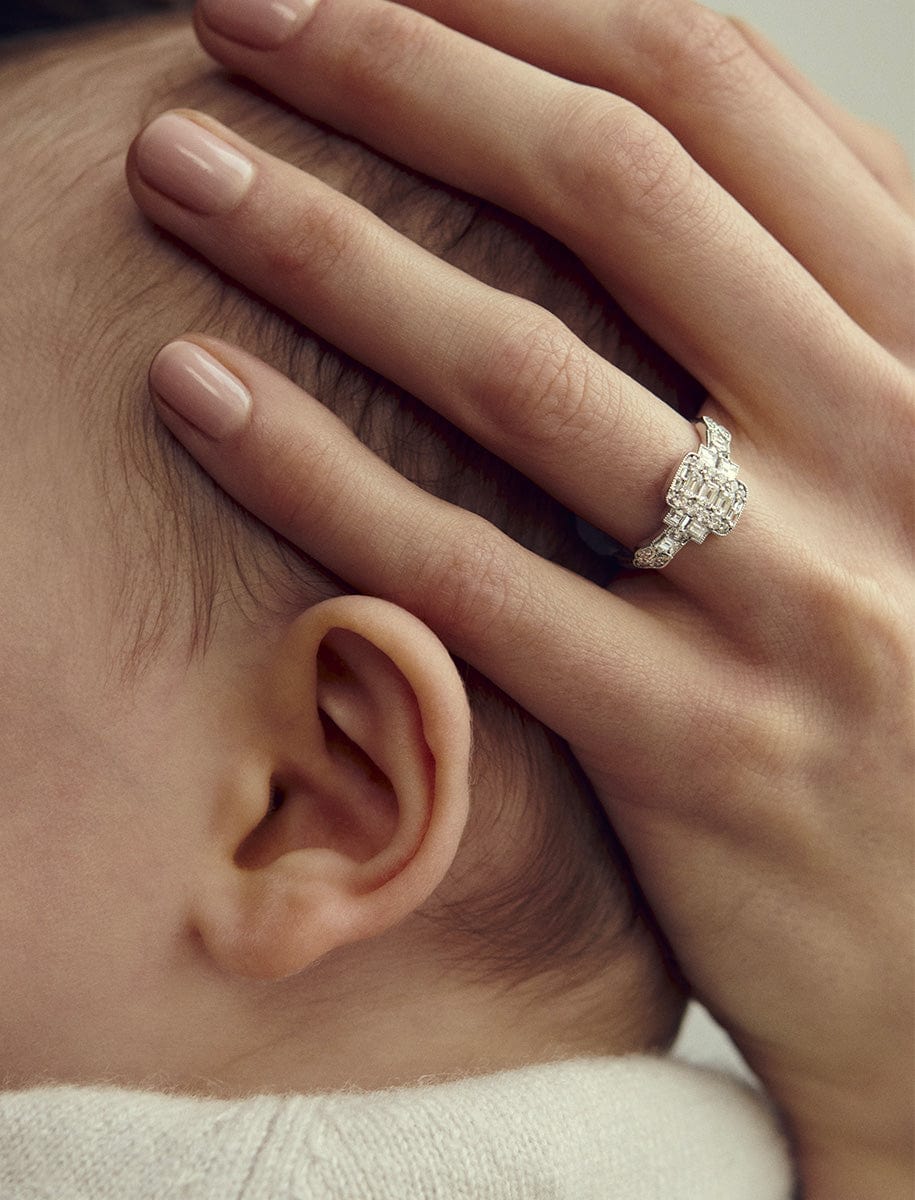 Avec sa forme cubique et ses diamants taille baguette, émeraude et ronde, qui donnent l'illusion d'un diamant central, ce bijou nous fait voyager dans le New-York des années 30, dans un univers flamboyant et avant-gardiste.